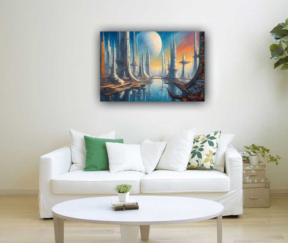 Transform your living or workspace with the Utopian Cityscape Painting, a masterpiece designed to inspire creativity and innovation. This stunning artwork captures the essence of an ideal, futuristic city, with intricate details and vibrant colors that bring your imagination to life.
