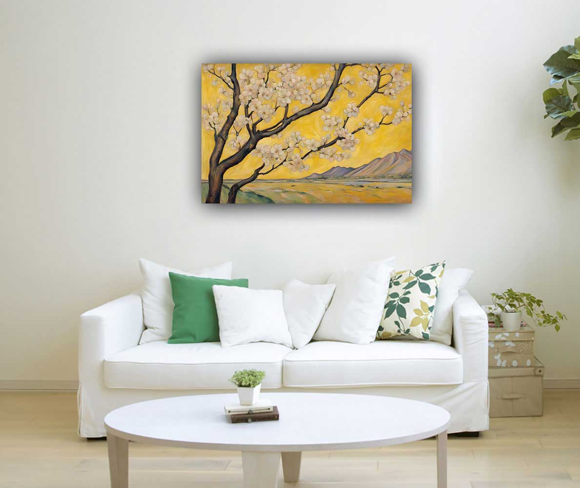 A cherry blossom painting placed in the South West direction beautifully symbolizes the delicate and enduring nature of relationships. Cherry blossoms, known for their fleeting yet profound beauty, represent the fragility and preciousness of love and connection. The soft, delicate blooms reflect the growth and blossoming of relationships, while the yellow color associated with the South West enhances feelings of warmth and security.