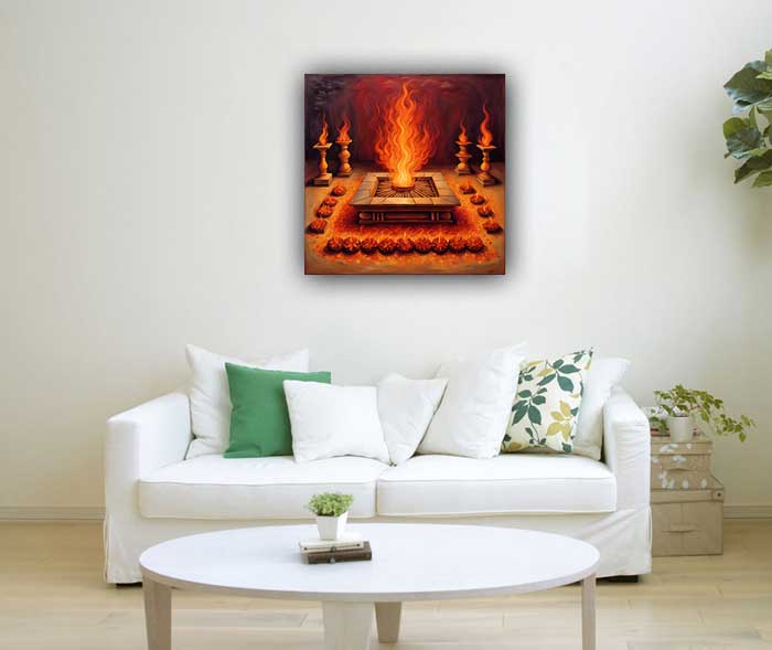 Havan Kund Painting: Wealth and Spiritual Energy as per Vastu The Havan Kund Painting, with vibrant red and orange tones, enhances cash flow and prosperity when placed in the South-East direction, the zone of wealth and Goddess Laxmi. Rooted in Vedic rituals, it symbolizes purification and spiritual growth, balancing material success with positivity and divine blessings.