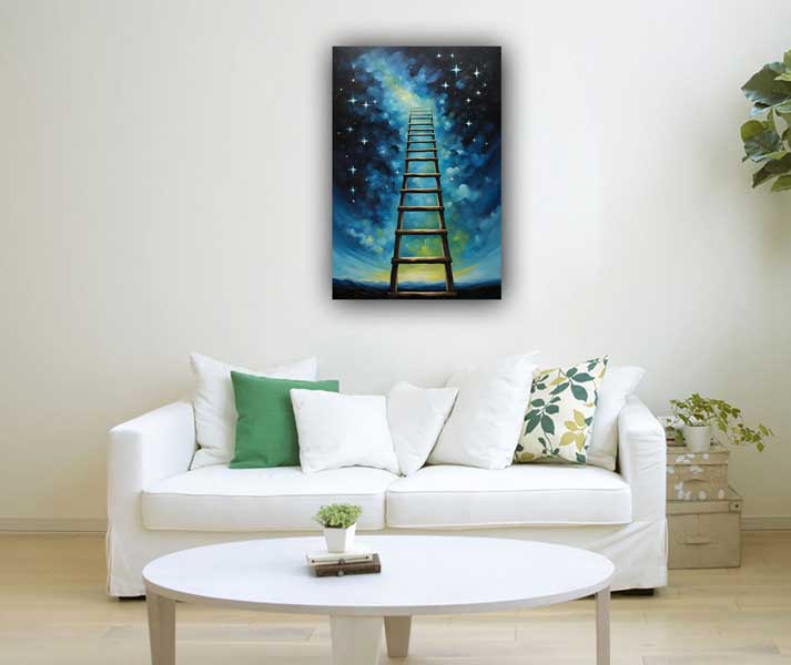 This inspiring painting features a ladder ascending towards a sky filled with stars, symbolizing unlimited career growth and success. Placed in the North direction as per Vastu principles, it attracts positive energy, enhances your professional aspirations, and encourages upward mobility in your career. The imagery of the ladder reaching for the stars signifies the pursuit of one's highest ambitions and potential, making it a perfect addition to any workspace or office to inspire progress and opportunity.