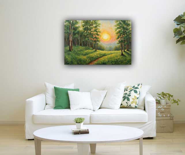 Discover the beauty of new beginnings with a sunrise over a lush green forest path artwork. Perfect for the East direction, it symbolizes growth, health, and rejuvenation as per Vastu principles.