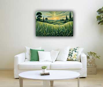 Enhance your space with a sunrise over green field painting, symbolizing new beginnings and growth. Ideal for East direction as per Vastu, this artwork radiates positivity and prosperity.