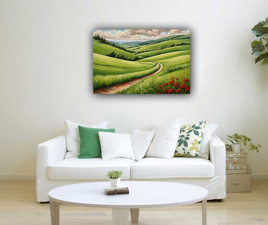 Enhance health, vitality, and growth with a painting of lush green rolling hills, perfect for placement in the East direction according to Vastu. This artwork brings natural energy, promoting well-being and a peaceful environment.
