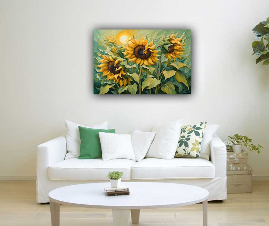 Discover the perfect artwork featuring blooming yellow sunflowers and a rising sun for positivity and new beginnings. Ideal for the East direction as per Vastu, this painting enhances energy and harmony in your space.