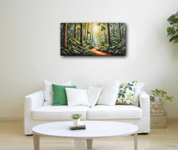 Enhance health and well-being with this Vastu-inspired dense evergreen rainforest painting. Perfect for the East direction, it promotes vitality, growth, and a harmonious environment.