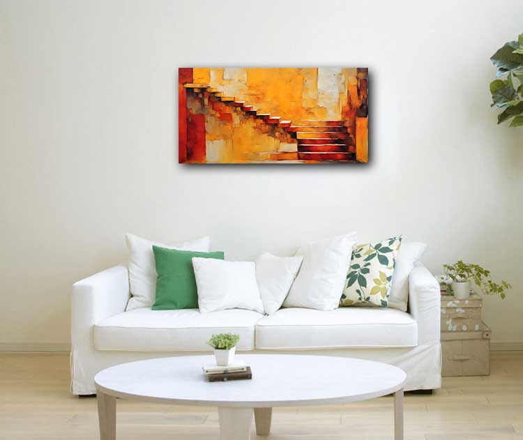 Elevate your space with this mesmerizing abstract artwork of staircases, symbolizing fame, recognition, and progress. Inspired by Vastu principles, this painting is ideal for the South direction, enhancing ambition, success, and elevation in career and life. The dynamic composition of ascending steps signifies continuous growth, while warm hues create a powerful and inspiring ambiance. Perfect for offices, living rooms, and workspaces, this artwork serves as a reminder of your journey towards greater achievements.