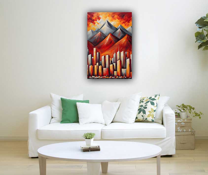 Discover a cityscape with majestic skylines and a mountain, symbolizing fame, recognition, and success. Ideal for the South direction as per Vastu, this artwork enhances reputation and leadership qualities. Perfect for professionals and entrepreneurs.
