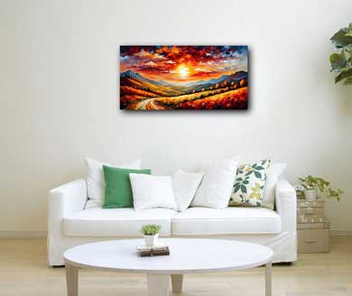 Enhance your fame, recognition, and success with this stunning Vibrant Sunset Over Rolling Hills painting, designed as per Vastu principles for the South direction. The warm hues of the sunset symbolize power, ambition, and growth, while the rolling hills represent stability and steady progress. Placing this artwork in the South zone energizes your space, boosting your social status, reputation, and career prospects. Ideal for homes, offices, and commercial spaces, this masterpiece radiates positivity, making it a must-have for those seeking name and fame.