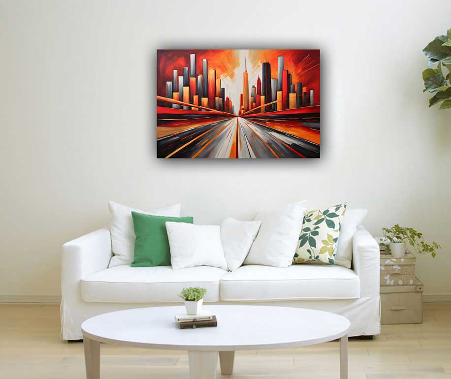 Enhance your space with this abstract skyline painting featuring an endless road, symbolizing fame, recognition, and career success. Perfect for the South direction according to Vastu Shastra.