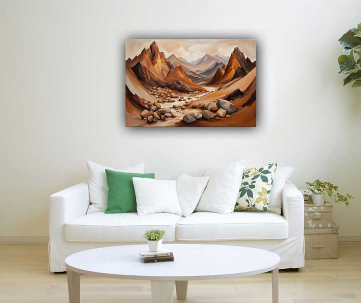 Enhance stability and strength with this earthy landscape artwork featuring mountains and rocks, perfect for the southwest direction. Create a balanced and secure environment with Vastu-inspired art designed to bring emotional stability and resilience to your space.
