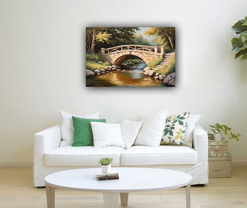 Enhance your social connections and communication with this beautiful arched stone bridge painting in a deep forest. Placed in the East direction, this Vastu-inspired artwork fosters harmony and strengthens relationships. Perfect for creating a positive and connected environment.