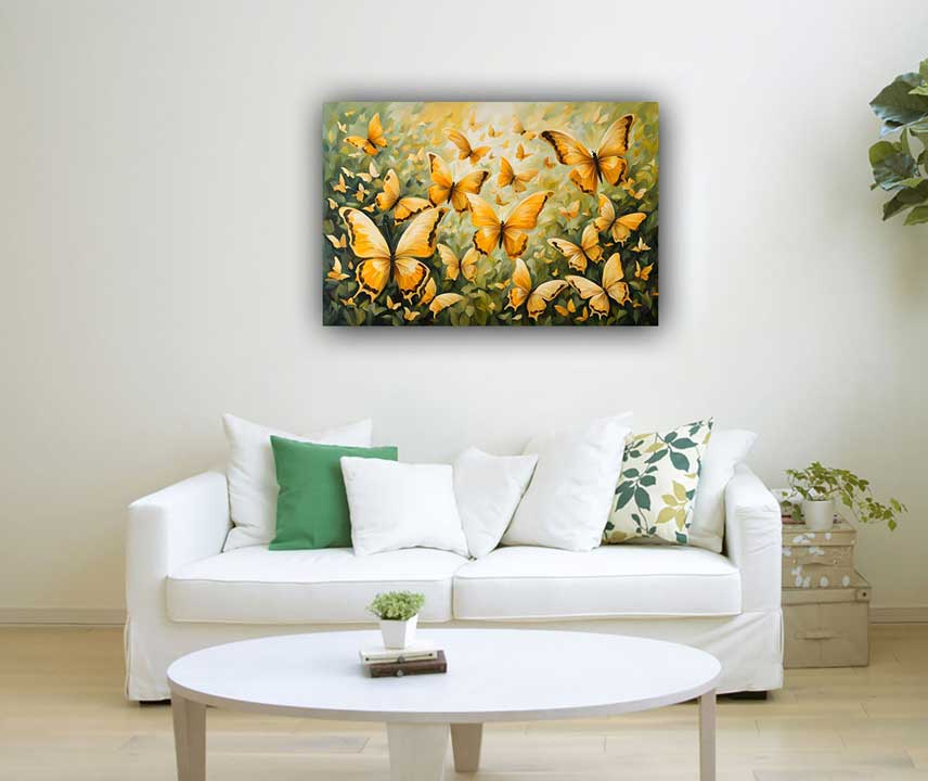 This stunning artwork of a group of butterflies in flight is the perfect addition to your space, especially for enhancing social connections and relationships. According to Vastu Shastra, placing this painting in the East direction promotes healthy communication, stronger bonds, and harmonious connections with others. The graceful butterflies symbolize transformation and the beauty of relationships, making this piece ideal for homes and offices. Its vibrant hues bring positivity and joy, creating a space that fosters collaboration and open dialogue.