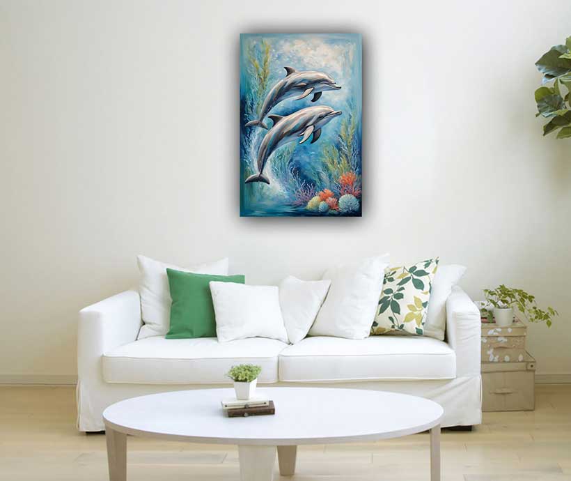 Transform your space with this serene painting of dolphins gracefully swimming in calm water amidst vibrant coral reefs. Designed as per Vastu principles, this artwork is ideal for the North direction, symbolizing the water element and promoting financial prosperity, growth, and opportunities. The soothing hues and lively composition create a harmonious ambiance, making it perfect for homes, offices, or meditation spaces. Enhance the energy of your environment and attract abundance with this masterpiece.