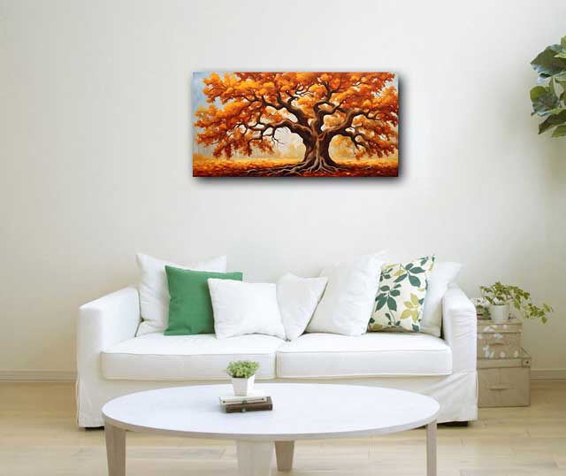 Elevate your space with this Abstract Oak Tree Painting, featuring golden and red leaves symbolizing power, confidence, and leadership. Ideal for the South direction as per Vastu.