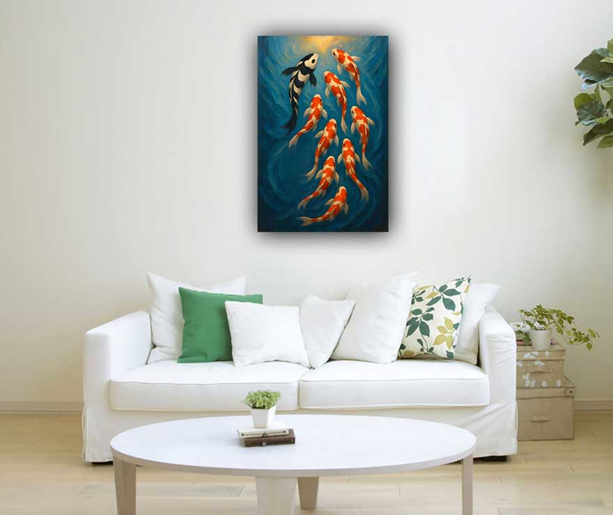 This 8+1 Koi Fish Painting is designed for placement in the North direction to enhance career growth, financial opportunities, and positive energy flow. Featuring eight golden koi fish symbolizing wealth and abundance, along with one black koi for protection from negativity, this artwork brings balance and prosperity into your space. Ideal for homes, offices, or business settings, the painting aligns with the Water element of the North, activating flow and success. Crafted on premium canvas with vibrant, fade-resistant colors, it’s a powerful blend of aesthetic beauty and Vastu significance.