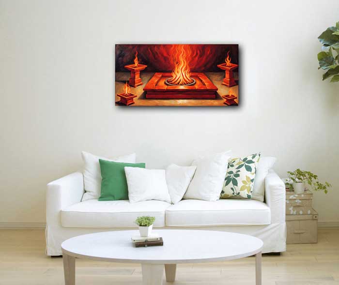Havan Kund Painting: Wealth and Spiritual Energy as per Vastu The Havan Kund Painting, with vibrant red and orange tones, enhances cash flow and prosperity when placed in the South-East direction, the zone of wealth and Goddess Laxmi. Rooted in Vedic rituals, it symbolizes purification and spiritual growth, balancing material success with positivity and divine blessings.