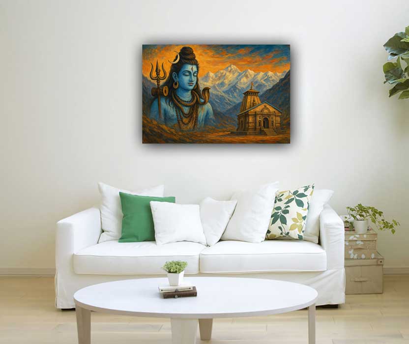 This divine Lord Shiva painting with Kedarnath Temple in the background symbolizes peace, devotion, and spiritual strength. It inspires inner calm and a deep connection with the divine.