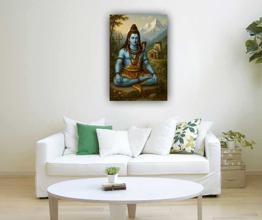 The divine landscape of snow-capped peaks, crystal-clear waters, and Lord Shiva's meditative form evokes a deep sense of inner peace, spiritual growth, and connection with the higher self. His presence in this setting also represents the harmony between nature and divinity.