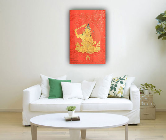 Manjushri is a bodhisattva, or enlightened being, in Buddhist tradition who represents wisdom, intelligence, and understanding. He is often depicted as a young prince holding a sword in his right hand and a text or book of wisdom in his left hand.