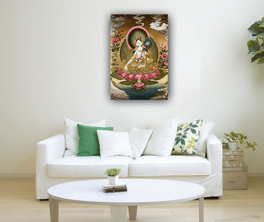 White Tara is a revered Buddhist figure associated with compassion, healing, and longevity. She is considered to be a female embodiment of the enlightened mind of the Buddha and is often depicted seated in a meditation posture with her right hand in the gesture of granting protection and her left hand holding a lotus flower. White Tara is believed to have the power to dispel fear, cure illness, and grant long life. She is also associated with purity and is often described as having seven eyes that symbolize her ability to perceive the suffering of all sentient beings.