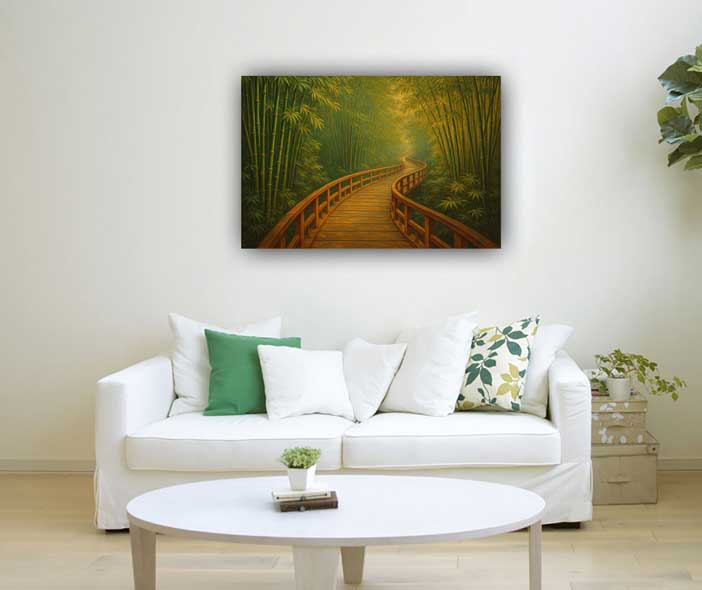 An Endless Path in a Bamboo Forest painting symbolizes growth, resilience, and limitless opportunities. In Vastu, placing it in the East or North-East direction enhances focus, clarity, and steady progress. The bamboo adds strength and harmony, making it ideal for workspaces, study rooms, or meditation areas to promote peace and forward movement.