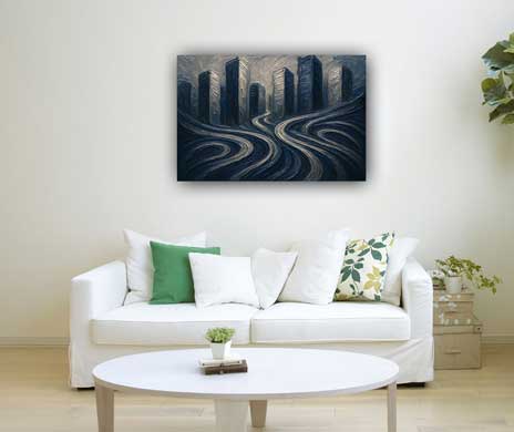 Modern cityscape canvas painting for North direction as per Vastu. Boosts career success and opportunities with Water element energy. Ideal for homes and offices.