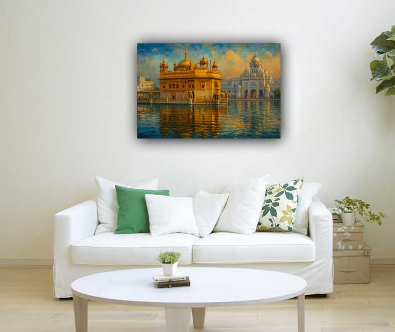 A Golden Temple painting symbolizes peace, purity, and spiritual harmony. It brings divine energy and serenity to any space, serving as a reminder of faith, devotion, and unity. Ideal for home or office, it creates a calming and sacred atmosphere.