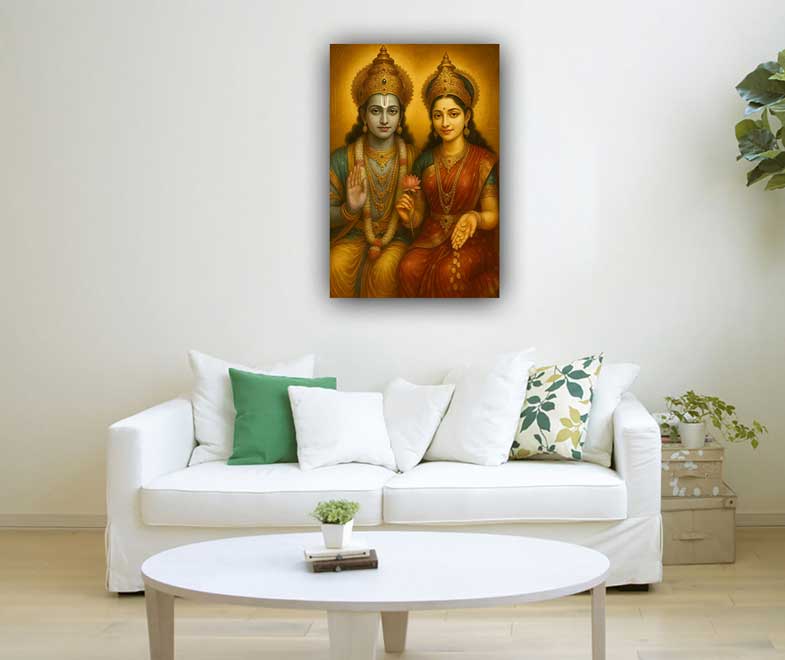 A painting of Lord Vishnu with Goddess Lakshmi is a divine representation of protection, harmony, and prosperity. Lord Vishnu, the preserver of the universe, symbolizes balance, strength, and stability, while Goddess Lakshmi embodies wealth, fortune, and abundance. Together, they radiate peace, blessings, and the promise of both spiritual and material growth.