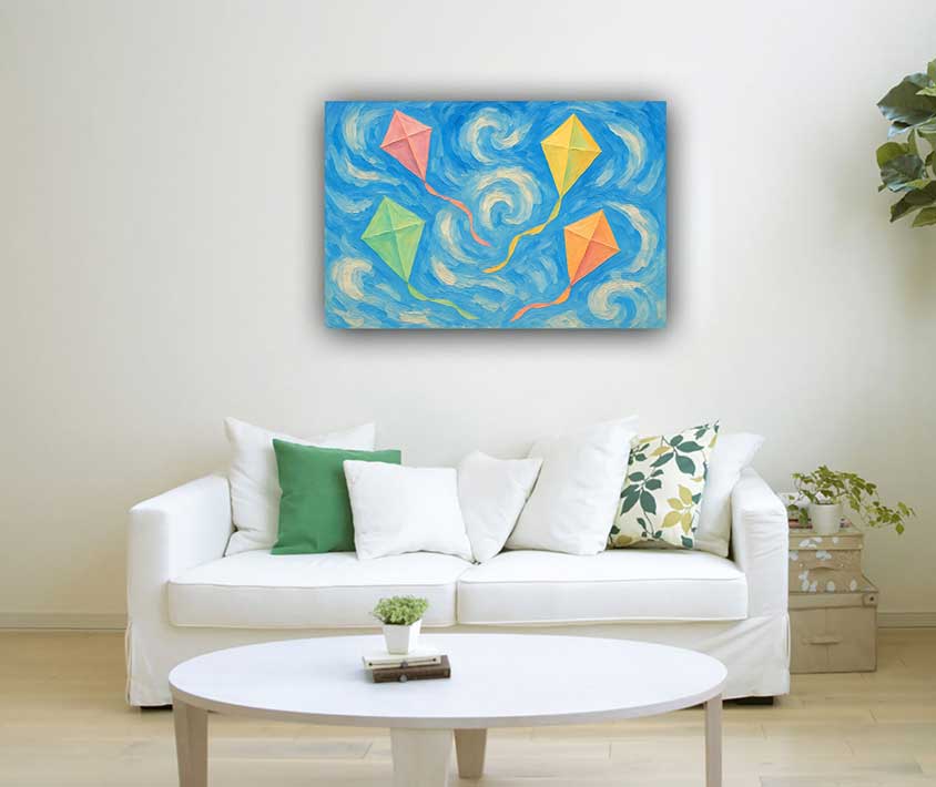 Bring home the Flying Kites Painting, a Vastu-inspired wall art for the west direction that enhances creativity, imagination, and innovation. Perfect for modern interiors, this canvas artwork radiates positivity and inspiration.
