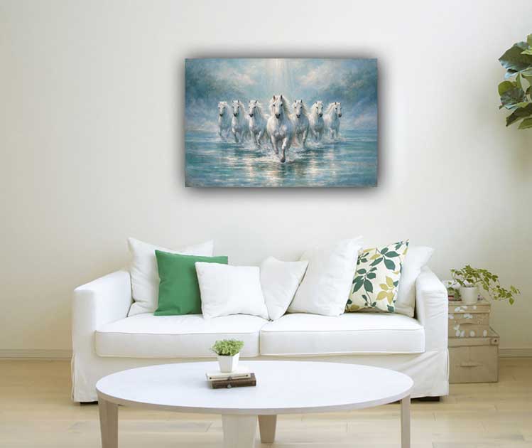 Seven White Horses Wall Art for North Direction is a classic and highly auspicious Vastu painting known to activate growth, progress, and professional opportunities. According to Vastu Shastra, the North direction governs career expansion, income flow, and life momentum—making this artwork ideal for offices, study rooms, and work-from-home spaces.The imagery of seven running white horses represents speed, discipline, confidence, and continuous forward movement. When placed in the North, this canvas painting is believed to remove stagnation, attract new opportunities, and support leadership growth.