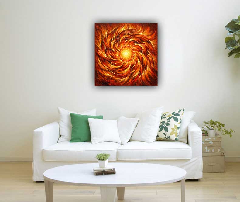 Abstract Fiery Swirls Wall Art is a powerful visual expression of movement, energy, and vibrant life force. The radiant spiral pattern at the center symbolizes continuous expansion, enthusiasm, and the dynamic flow of life. The glowing core represents inner energy, while the outward swirling strokes reflect growth, momentum, and unstoppable passion. In vastu paintings, spiral and circular forms are associated with positive energy flow, expansion, and dynamic progress. The radiant center symbolizes a source of power and positivity, helping to uplift the mood and encourage creativity and motivation.