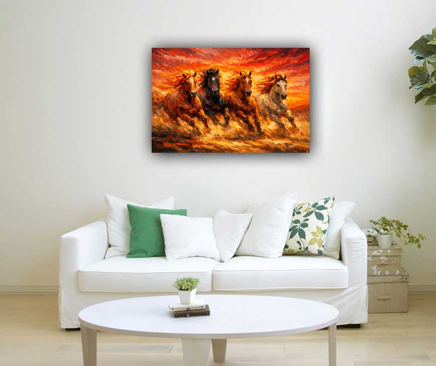 This dynamic wild stallions canvas wall art represents freedom, strength, and unstoppable energy. The powerful movement of the horses symbolizes courage, independence, and enthusiasm for life. Perfect for living rooms, offices, or creative spaces, this artwork on canvas energizes the environment and inspires action. As a vastu painting, it enhances motivation, determination, and forward momentum, making it an excellent addition to modern interiors.
