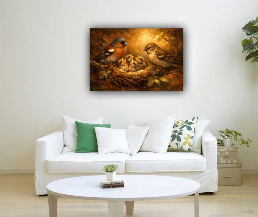 A bird family in nest painting symbolizing nurturing love, warmth, and emotional security.