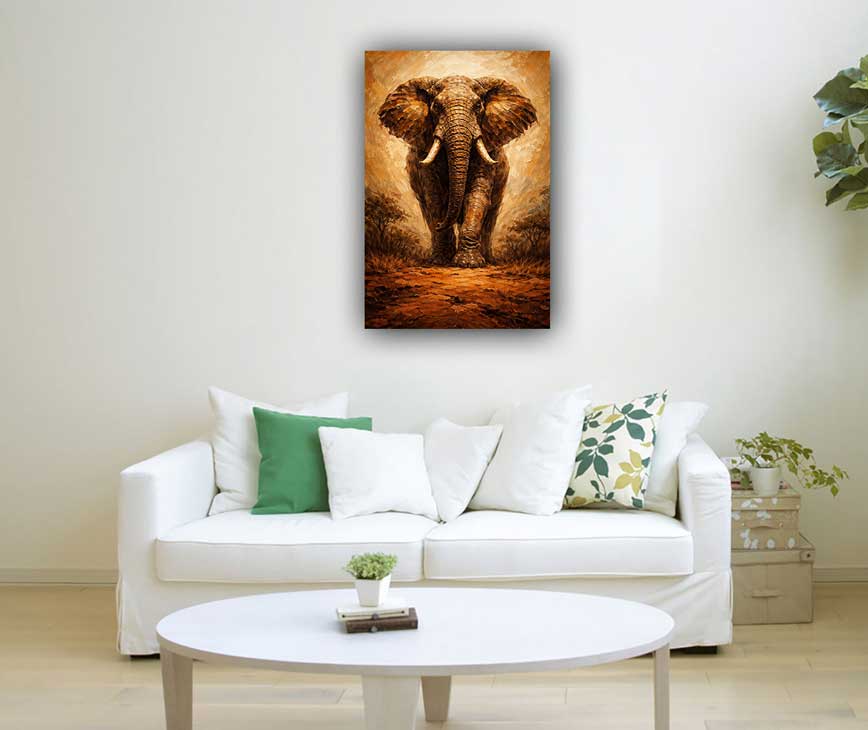 This majestic elephant in savannah painting symbolizes immense strength, wisdom, and patient endurance. The elephant represents calm authority and grounded power, while the open savannah reflects freedom and stability. The balanced composition creates a sense of confidence and resilience. As a vastu-inspired artwork, it promotes strength, attracts positive energy, and encourages patience and steady growth in life.
