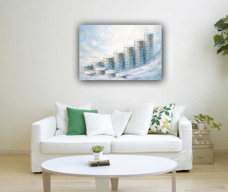 This abstract painting of stacked silver coins represents steady financial growth, discipline, and long-term stability. The layered coin forms symbolize accumulation, consistency, and smart wealth-building practices. With modern textures and metallic tones, the artwork inspires focus and financial awareness. Ideal for offices, study areas, or wealth corners, it promotes a stable and growth-oriented mindset. As a vastu painting, it helps attract financial balance, strengthen savings energy, and support prosperity. Perfect as wall art, canvas wall art, or modern canvas prints, it adds a refined and meaningful touch to your décor.