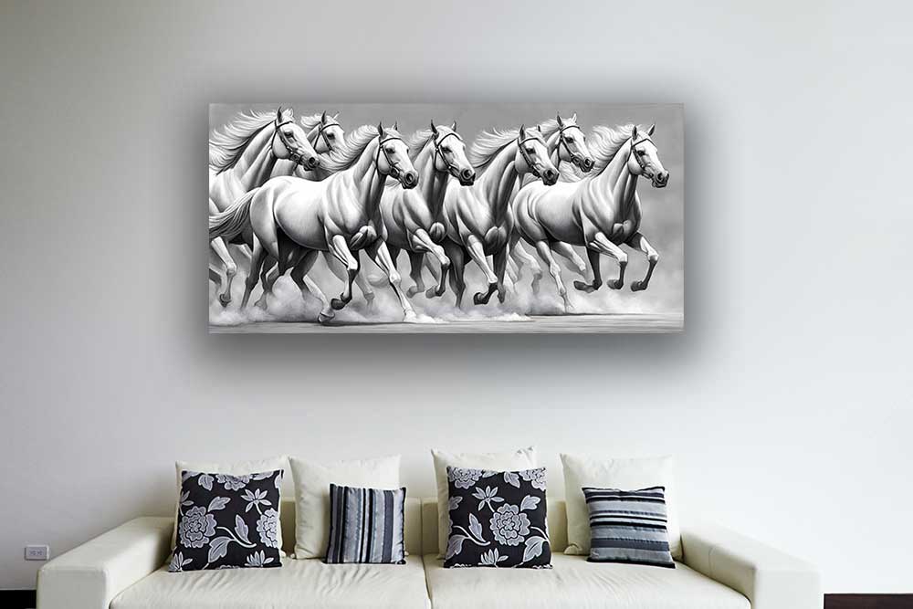 Seven Horses Painting: A magnificent masterpiece that gracefully embodies power and prosperity. This elegant artwork infuses your living space with an aura of positivity, creating a captivating blend of art and symbolism.
