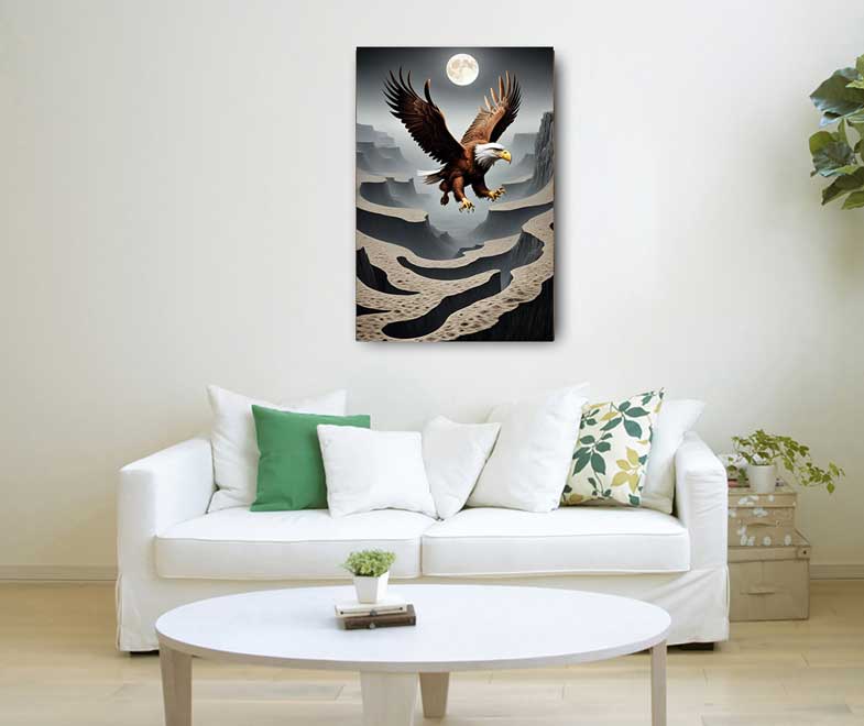 In Vastu Shastra, an ancient Indian architectural and design philosophy, the Soaring Eagle is often considered a symbol of strength, courage, and protection. The eagle is associated with the element of air and is believed to have a positive impact on the energy flow within a space. Here are some aspects of the Soaring Eagle in Vastu paintings and their perceived importance: