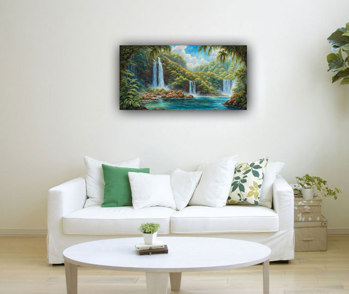 In Vastu Shastra, an ancient Indian architectural philosophy, waterfalls symbolize abundance, prosperity, and the flow of positive energy. Placing a waterfall painting in the north or northeast direction of a home or office is believed to attract wealth and financial success. The flowing water in the painting represents the constant flow of opportunities and resources into one's life.