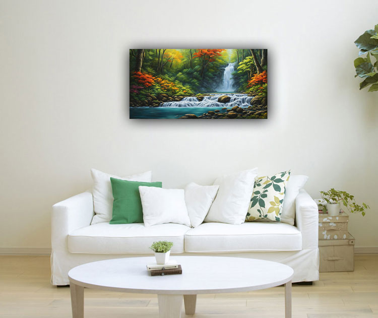 In Vastu Shastra, an ancient Indian architectural philosophy, waterfalls symbolize abundance, prosperity, and the flow of positive energy. Placing a waterfall painting in the north or northeast direction of a home or office is believed to attract wealth and financial success. The flowing water in the painting represents the constant flow of opportunities and resources into one's life.