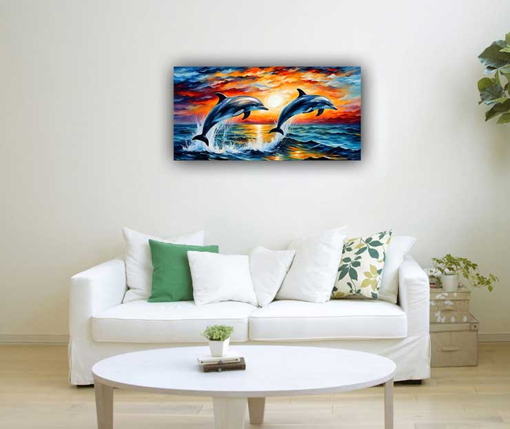 Connection with Water Element: Water is a fundamental element in Feng Shui associated with flow, abundance, and purification. Dolphins, as creatures of the sea, embody the vitality and movement of water. Pairing dolphin paintings with water-themed decor or placing them in areas representing the water element (such as the north or east sectors of a space) enhances the flow of positive energy and attracts prosperity.