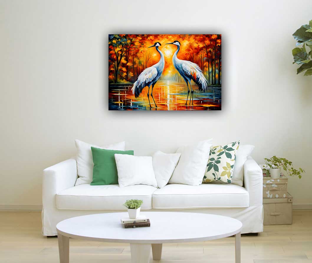 Enhancement of Peace and Serenity: The serene and graceful nature of cranes promotes peace and tranquility. A pair of cranes painting can create a calming atmosphere, reducing stress and encouraging a peaceful environment conducive to relaxation and reflection.