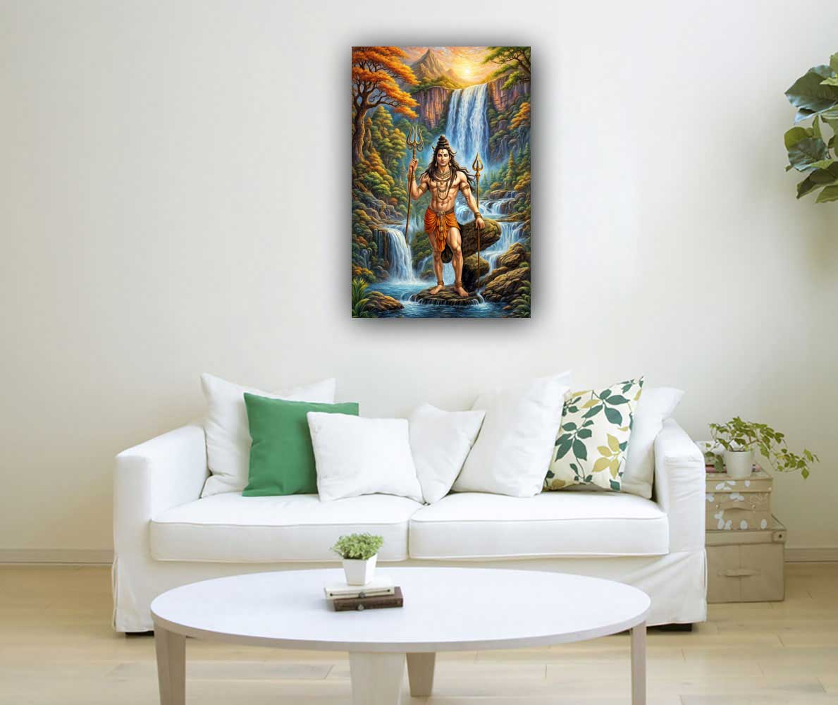 A Lord Shiva painting with Kailash Mansarovar in the background embodies divine power and tranquility. Depicting Shiva meditating before his sacred mountain abode, this artwork symbolizes spiritual strength and peace, making it perfect for creating a serene, positive atmosphere in any space.