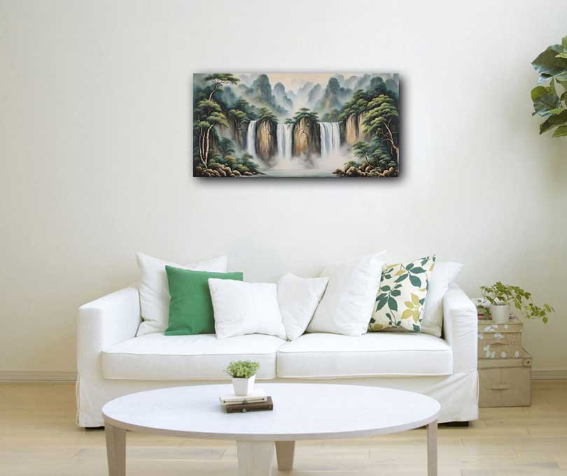 Waterfall painting is a captivating art form that often depicts the serene and dynamic flow of water cascading down a rocky terrain. It captures the essence of movement, tranquility, and the rejuvenating power of nature. In both Vastu and Feng Shui practices, waterfall paintings hold significant importance, particularly in enhancing wealth and prosperity.