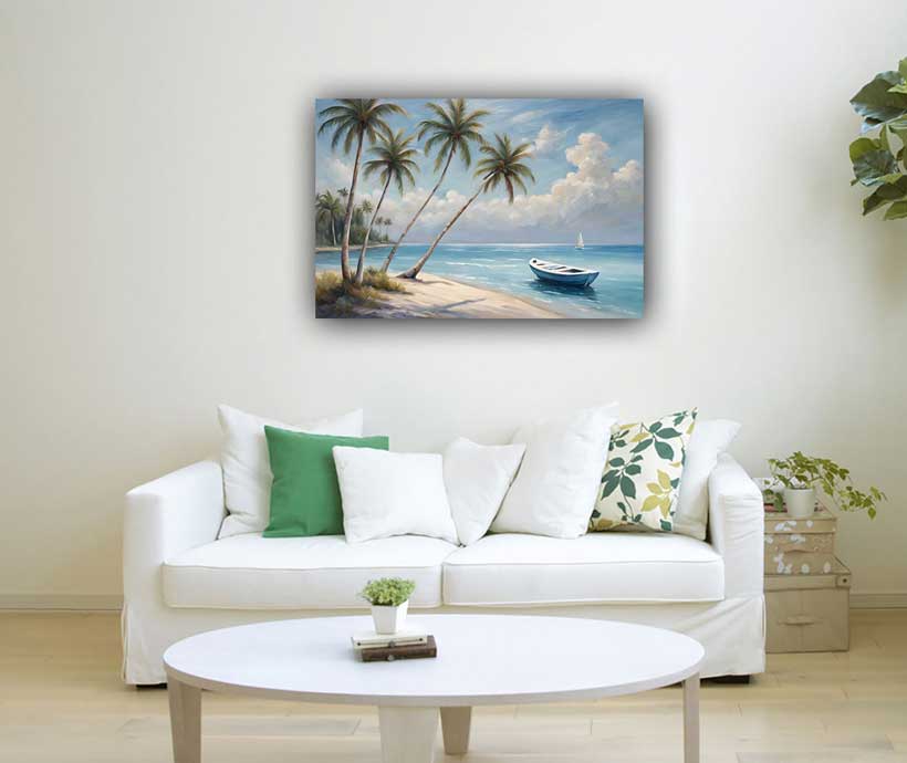 Enhance your career growth with this ocean painting featuring pine trees and a boat, placed in the North direction. Ideal for attracting opportunities and success in your professional life, this Vastu-inspired artwork promotes the flow of opportunities and supports career advancement.
