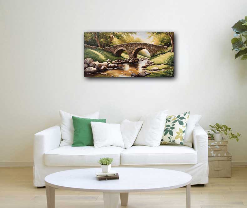Enhance your home or office with the timeless beauty of the "Arched Stone Bridge Nestled in a Lush Forest" artwork. This painting captures the serenity of an arched stone bridge surrounded by vibrant greenery, symbolizing connection, relationships, and harmony. Ideal for placing in the East direction as per Vastu principles, it promotes healthy social bonds, communication, and personal growth. The intricate details of the lush forest and the elegant design of the stone bridge make it a masterpiece of natural tranquility. Perfect for anyone looking to create a positive and harmonious environment.