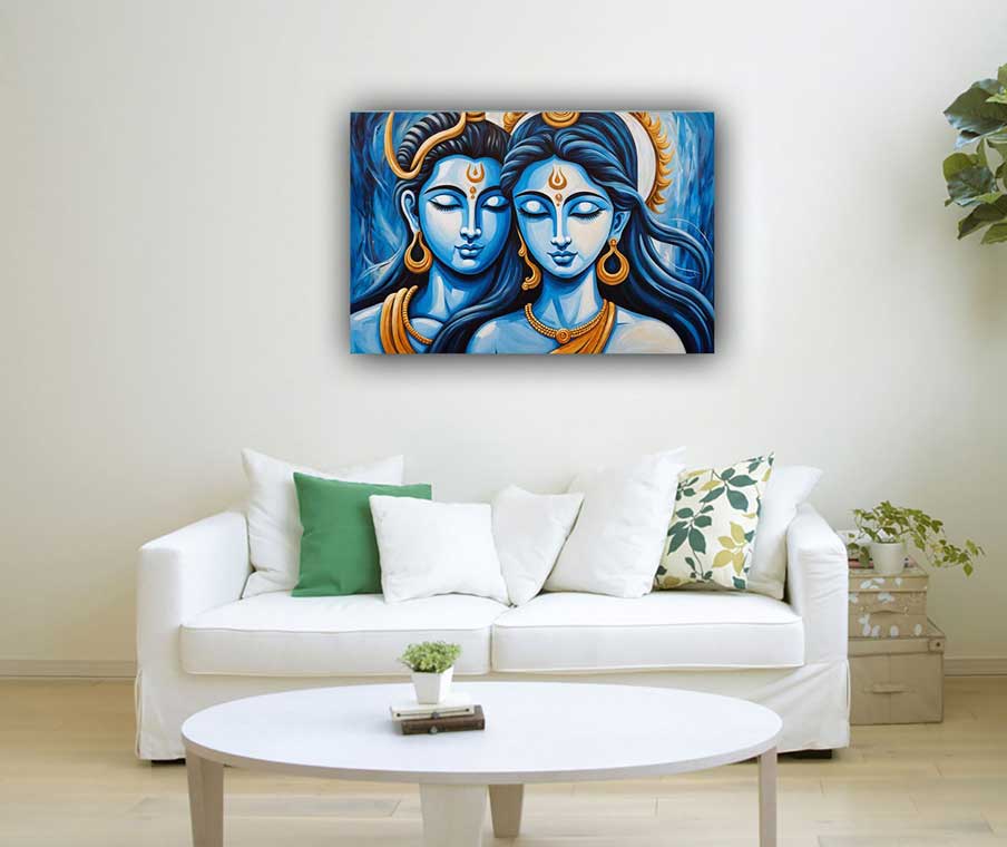 Enhance the spiritual energy of your space with this modern oil painting depicting Lord Shiva and Goddess Parvati. Designed for placement in the northeast direction, this artwork aligns with Vastu principles to promote wisdom, clarity, and spiritual enlightenment. The divine union of Shiva and Parvati symbolizes balance, devotion, and cosmic harmony, making it an ideal addition to meditation spaces, prayer rooms, or homes seeking positive energy. The intricate brushwork and soothing color palette evoke a sense of tranquility, making this painting a perfect blend of traditional divinity and contemporary aesthetics.