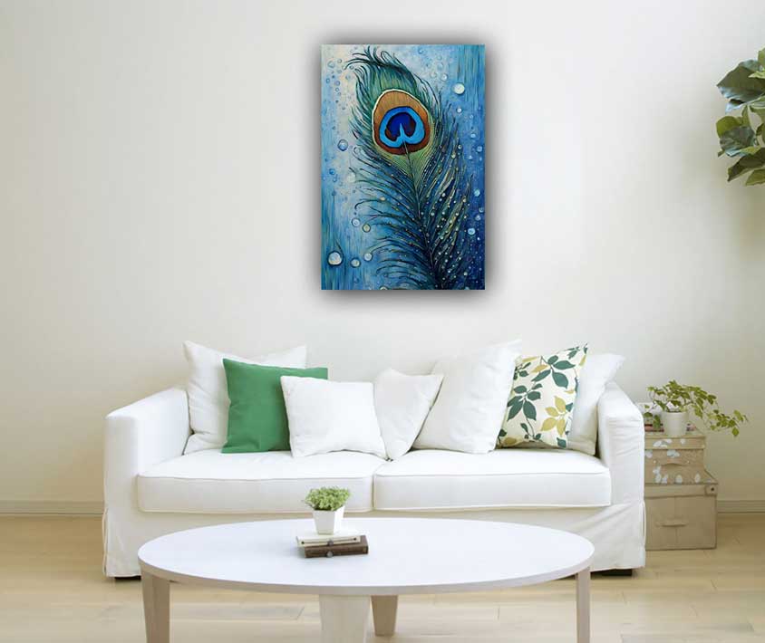 Embrace the beauty and symbolism of this exquisite artwork featuring an elegant peacock feather adorned with dewdrops, designed to enhance your spiritual growth and enlightenment. Positioned in the Northeast direction as per Vastu Shastra, this painting radiates positive energy and encourages mental clarity, wisdom, and inner peace. The delicate feather, paired with the refreshing dewdrops, represents purity, transformation, and the awakening of your spiritual journey. Ideal for meditation spaces, study rooms, or any corner dedicated to cultivating spiritual strength and wisdom.