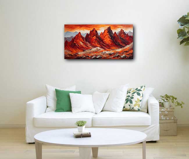 Enhance your space with this stunning artwork of rocky red-hued mountains reminiscent of the desert, symbolizing fame, recognition, and success. As per Vastu Shastra, placing this painting in the South direction amplifies authority, stability, and career growth. The bold earthy reds and deep terracottas evoke a sense of strength, resilience, and ambition. Perfect for offices, living rooms, and workspaces, this masterpiece exudes confidence and power, helping you rise to greater heights in life.