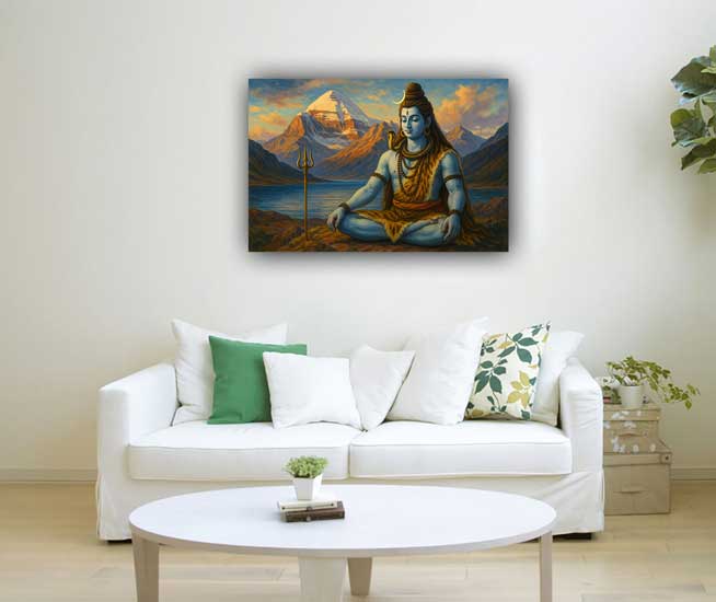 This painting shows Lord Shiva in deep meditation before the serene Mount Kailash and Mansarovar Lake, symbolizing peace, purity, and spiritual power. It evokes calmness and divine energy.