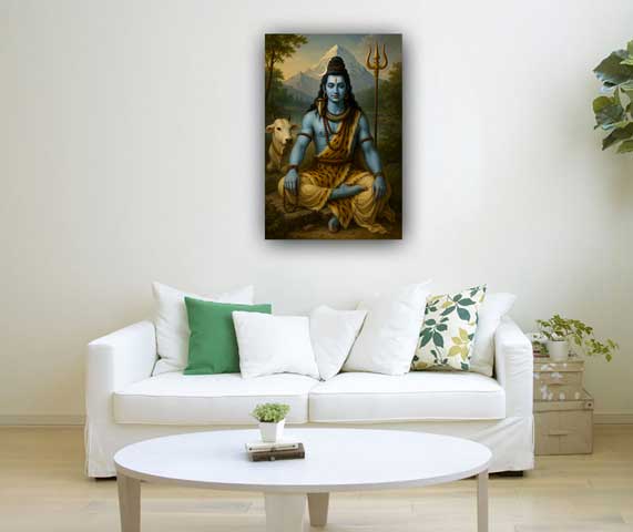This painting shows Lord Shiva in deep meditation before the serene Mount Kailash and Mansarovar Lake, symbolizing peace, purity, and spiritual power. It evokes calmness and divine energy.